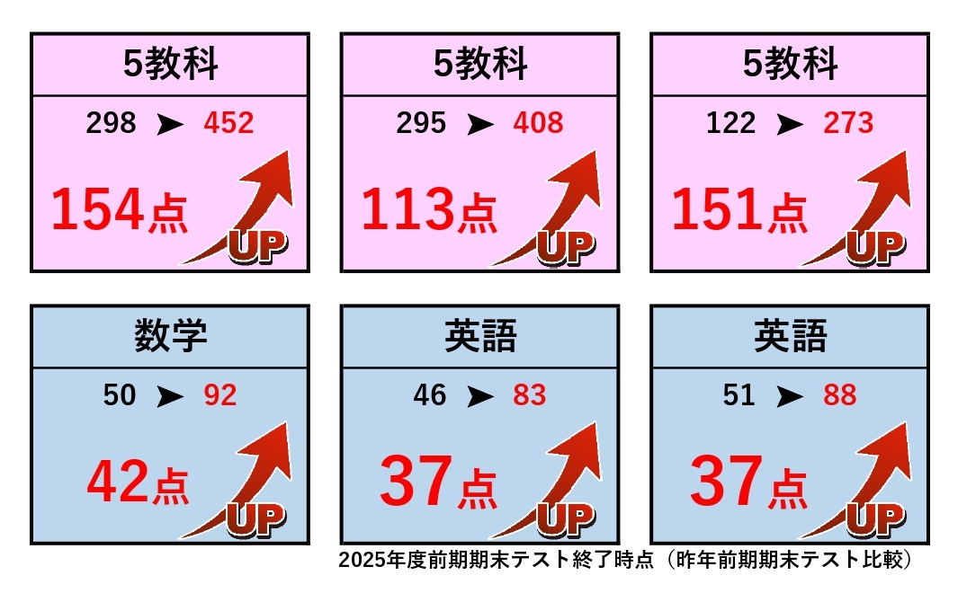入塾時から現在までの中学校定期テストの点数UP(一例)を載せました。人数が少ないので実績はまだまだですが、ここに載せた人だけでなく、みなさん確実に知識をつけていっています!