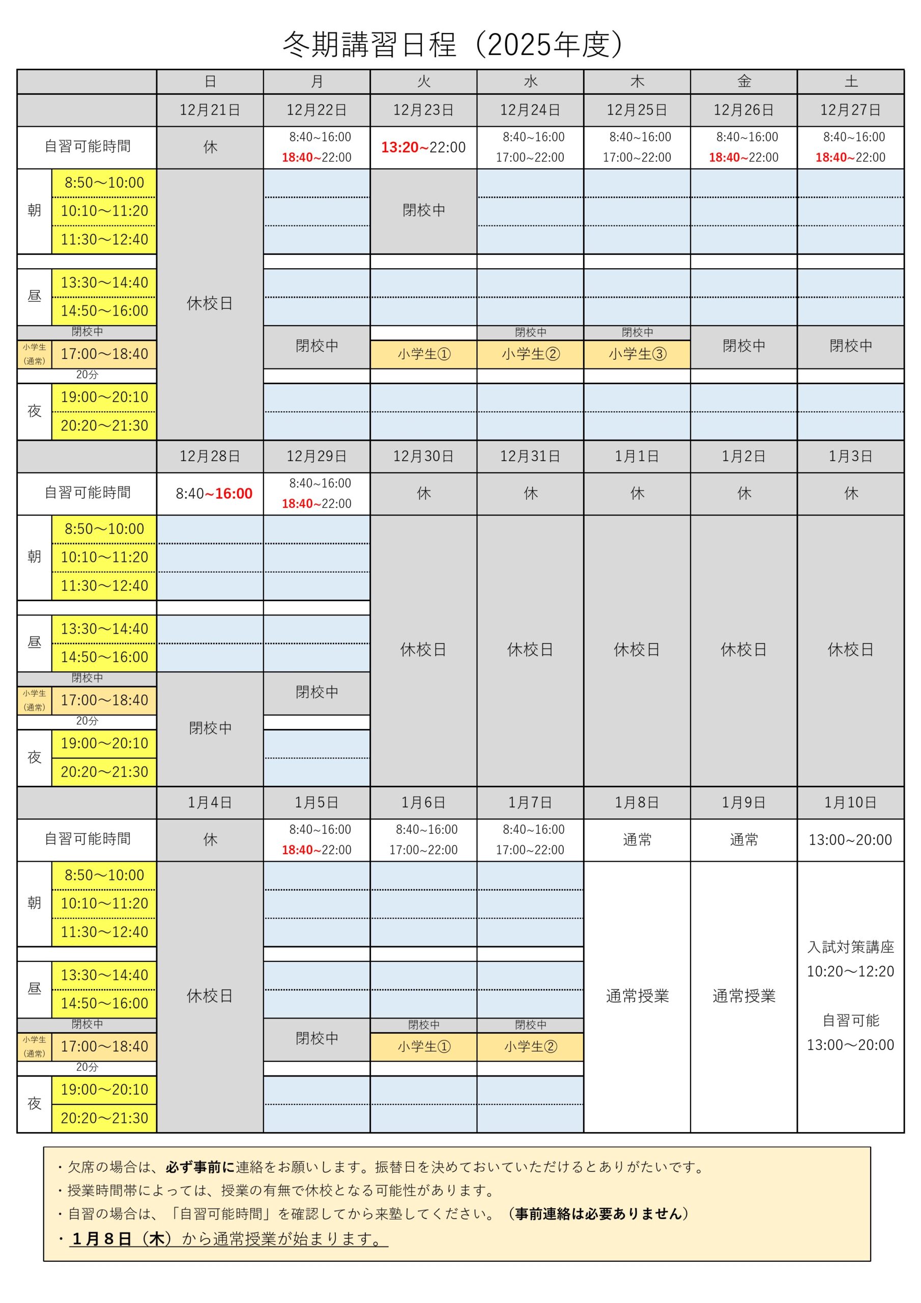 ウィズ進学塾では、2025年12月22日(月)~2026年1月7日(水)の期間中、中学生を対象に冬期講習を実施いたします。年末年始のこの時期は、勉強を特にサボりがちになってしまいやすい期間であるといえます。中1,2生にと […]