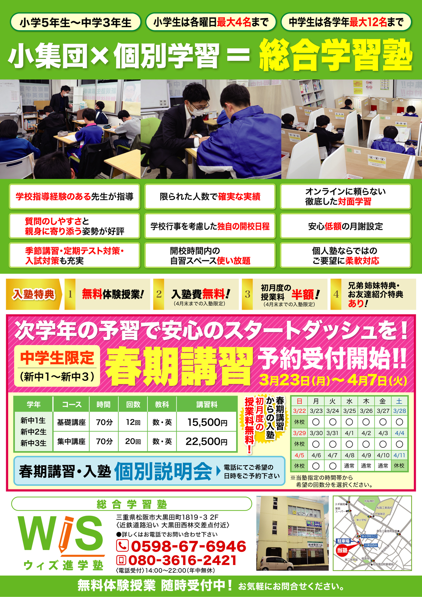 ウィズ進学塾では、3月23日(月)~4月7日(火)の期間中、新中1生~新中3生を対象に春期講習を実施いたします。新中1生にとっては、中学を迎えるにあたって、スタートダッシュが切れるように、数学と英語の予習を行います。新中 […]