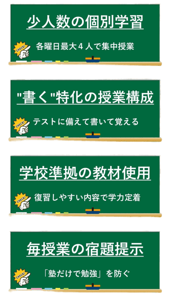 小学校の学習内容を定着させ、弱点克服を目指します。中学校に上がった時のことを最優先に考え、授業を構築しています。算数・国語では学校の復習を中心に取り組み、英語では中学校での学習内容を見越して「書く」ことに重点を置いて予習の形を取っています。原則毎時間宿題を出しています。無理のないペースで進めていきますので、初めて塾に通われる方でも安心して取り組める内容になっています。