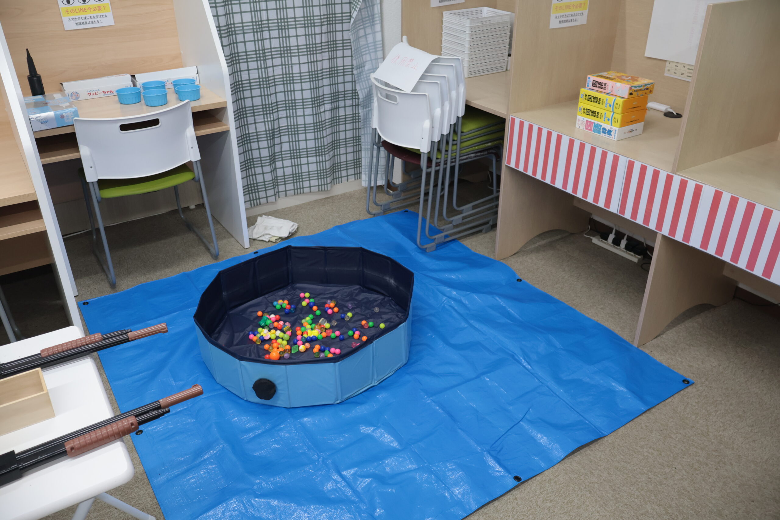 射的やスーパーボールすくい、かたぬきなどを用意しました。もちろん、ゲームやお菓子の持ち込みOK、音楽OK、自由に遊べる空間にしたつもりです。今年はゲーム用にモニターを導入し、より快適にみんなで遊べるようにしました。塾内では人気のピザを筆頭に、おにぎりやドーナツ、ポップコーン、ドリンクなども用意していましたが、今年はすべての食べ物がきれいになくなっていたので、みなさんの食欲にただただ驚かされています。(塾生の差し入れなどもありましたから、かなりあったのに汗)