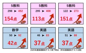 定期テスト実績(前期期末テスト時点) 2025年9月25日 | コメントはまだありません | 実績 1年前の前期期末テストからの点数UP(一例)を載せています。ウィズ進学塾では、学力向上はもちろんのこと、生徒の勉強への意識も向上していけるように日々接しています。自ら考え、自ら進んで行動できる人間になれるよう、全力でサポ […] もっと読む »