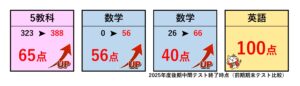 定期テスト実績(後期中間テスト時点) 2025年12月13日 | コメントはまだありません | 実績 前回のテスト(前期期末テスト)からの点数実績になります。点数が上がった子の中でも特に嬉しかったものを今回は載せています。ウィズ進学塾では、どんな学力の子でもやる気があれば、学力を上げるために全力で向き合っていきます。 もっと読む »